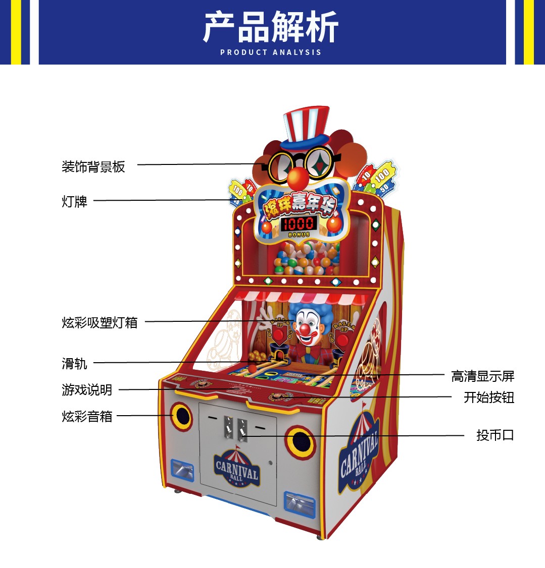 《滚球嘉年华》是一款嘉年华类滑球游戏,结合嘉年华的风格和我国经典的玩法进行创新,机台外观时尚新颖,玩法简单有趣。